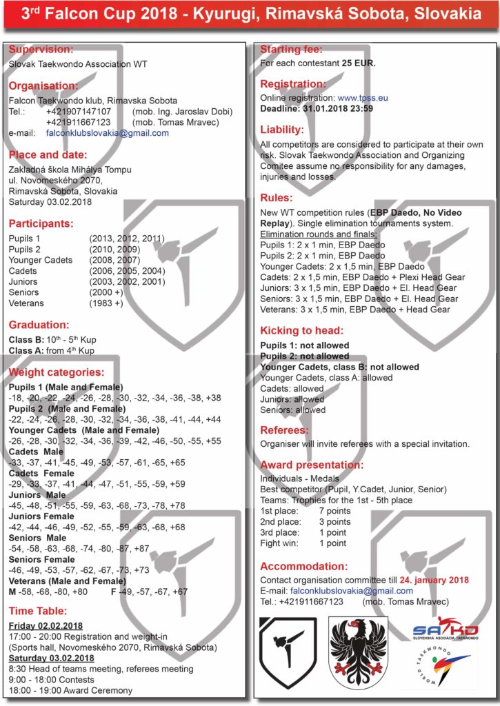 1. kolo ligy zápas – Falcon Cup 2018 v RS 21. 01. 2018 Nezabudnite si skontrolovať zdravotné prehliadky, uhradiť asociačné a prihlásiť sa trénerke.Kategória:Súťaže Ďalšie Predošlá:Výsledky z Majstrovstiev Slovenska Back: Všetky články Nasledujúca:Výsledky z páskovania December 2017
