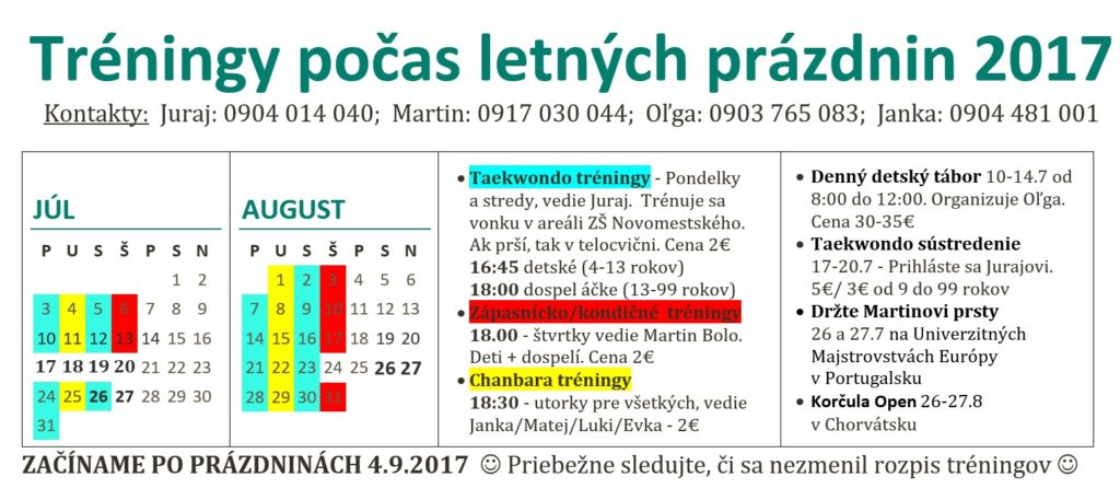 Počas letných prázdnin budú prebiehať tréningy v prázdninovom režime. Kategórie budú pospájané a platí sa za každý tréning zvlášť. Niektoré tréningy budú prebiehať vonku, ak nebudete chodiť pravidelne, tak odporúčame sa informovať u trénera, kde sa cvičí :) Ak potrebujete informácie, ktoré nie sú v rozpise, kontaktujte trénerku Janku na 0904 481 001.